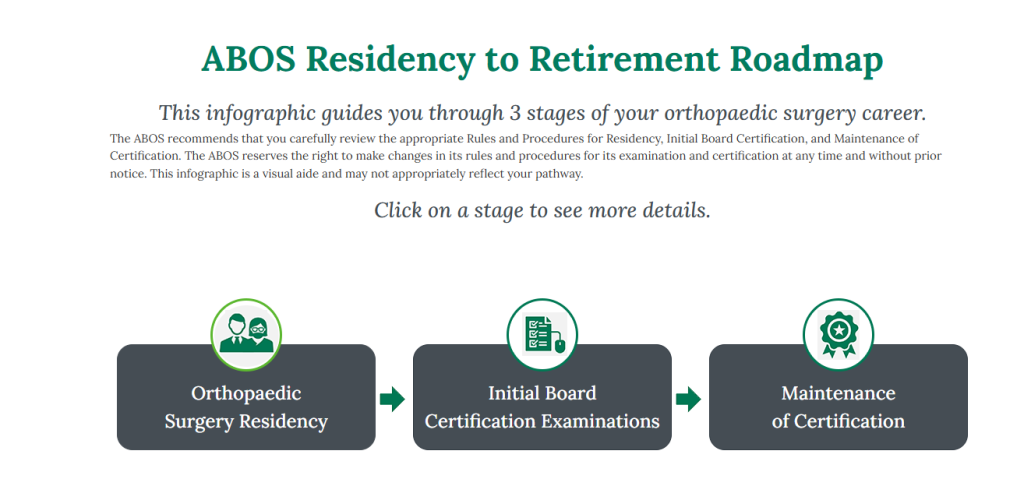 The American Board of Orthopaedic Surgery (ABOS) has an easy-to-understand roadmap that explains each step in the ABOS Board Certification and Maintenance of Certification process—from residency to retirement. Visit abosroadmap.org throughout your orthopaedic surgery career to make sure that you remain on schedule.