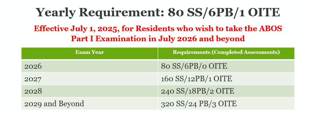 Starting July 1, 2025, all residents who wish to be ABOS Board Certification Candidates must participate in the ABOS KSB Program to be eligible to take the ABOS Part I Examination (the first step in the ABOS Board Certification process). Currently, it is a participation requirement only. The ABOS is only looking at participation levels, not at levels of achievement on the assessments. Participation requirements based on your current PGY can be found here.